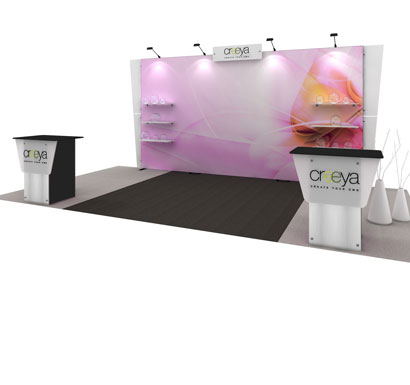 Creeya is light weight tool free portable and modular system which are comprised of 2 basis aluminum profiles. An innovative locking and extension mechanism makes this system ideal for use in small inline exhibits spaces as well as large format displays. It is currently available in 10x10 and 10x20 incline configurations. The uniquely engineered profiles allow use of different graphic media such as fabric sintra and even wood panels.