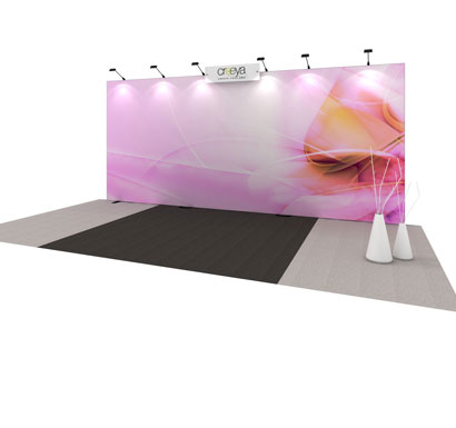 Creeya is light weight tool free portable and modular system which are comprised of 2 basis aluminum profiles. An innovative locking and extension mechanism makes this system ideal for use in small inline exhibits spaces as well as large format displays. It is currently available in 10x10 and 10x20 incline configurations. The uniquely engineered profiles allow use of different graphic media such as fabric sintra and even wood panels.