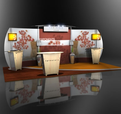 This 10' x 20' LUMINENTS island exhibit provides 2 video workstations and a reception counter with locking storage. The design reconfigures easily to a 20' x 20' island and a 10' x 30' linear exhibit.